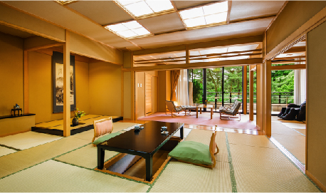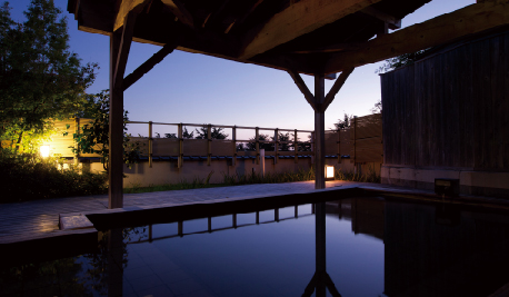新館・鳳凰では、すべてのお部屋に源泉露天風呂と源泉内風呂を設えて、時間を気にすることなくいつでも温泉三昧をお楽しみいただけます。庭園の折々の景色を楽しみながら、格別の時間をお過ごしください。