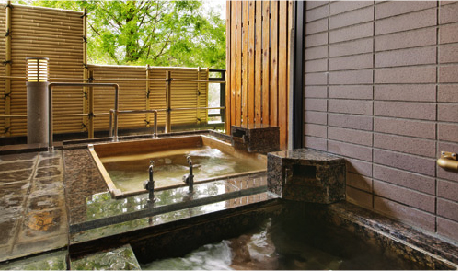 本館一階に、安土桃山庭園に面した男女別の露天風呂付き大浴場があり、新館鳳凰の最上階(五階)には白山連峰や自館の庭園を望む3つの展望露天風呂「木犀」「玉竜」「雷鳥」があります。