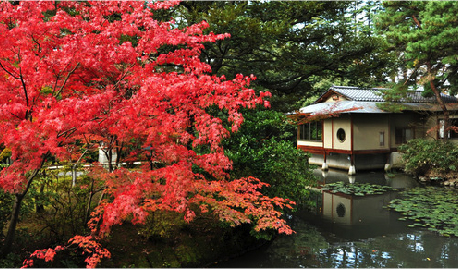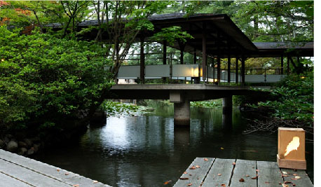 到着されたお客さまをお迎えするのは日本庭園。池に架けられたエントランスへと続く回廊を渡りながら池に目を落とせば、錦鯉が優雅に泳ぎながら寄ってきます。桜が咲きほこる春、蓮の花がほほえむ夏、秋には樹々が美しく紅葉し、冬には庭のすべてが楚々とした雪化粧をいたします。