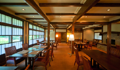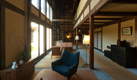 「源助門」をくぐり、薪が並ぶ通路を抜けると、そこにある「源助茶屋」。暖炉や釜戸、障子や民芸調の家具など、田舎の民家をイメージした情緒あふれる外観とモダンただよう内装が、足を踏み入れた瞬間から、まさに「ふるさと」に帰省した時の安堵感とくつろぎ感に包んでくれます。